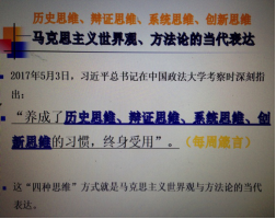 考察时提出的“四种思维”方式做了深入讲解与阐释。她首先把习近平总书记的殷切寄语——“养成了历史思维、辩证思维、系统思维、创新思维的习惯,终身受用”作为每周箴言,让同学们齐声朗读。进而指出:这“四种思维”方式就是马克思主义世界观和方法论的当代表达。但张老师并没有直接阐释这“四种思维”方式,而是让同学们回答“思想、观念与立场、价值、利益的关系”。当三名同学集体上来陈述自己的观点后,张秀华老师才对习近平总书记提出的“四种思维”方式做了具体阐发。在她看来,“历史思维”,就是要坚持马克思主义以历史性为基础的历史主义——历史唯物主义的立场;看待问题不要仅仅停留在道德批判的价值尺度,还要有历史的尺度;动态、过程地考察问题,即用“历史的逻辑”代替静态的、知性的传统“科学的逻辑”。“辩证思维”说的是,要按照唯物辩证法、实践辩证法、历史辩证法的思维方式,用变化、发展的眼观看待事物,用一分为二的矛盾方法分析问题,寻求对立面的统一。“系统思维”就是依循马克思主义整体论的方法、总体性的方法,把要素放到系统中来理解,把部分放到整体中来理解,把事物放到社会总体的进程中、在各种关系中来理解,而且系统、整体、总体比要素、部分和个别事物具有理解的优先性。“创新思维”这是马克思主义辩证法的根本要求,即批判性、革命性,不断使现实世界革命化;也是马克思主义理论品格——与时俱进的体现。最后,她还引用习近平总书记“7.26”重要讲话内容,再次说明这“四种思维”根本来说就是马克思主义总体性辩证法的集中阐发,并体现了现代唯物主义、新唯物主义的立场和实践的首要观点。