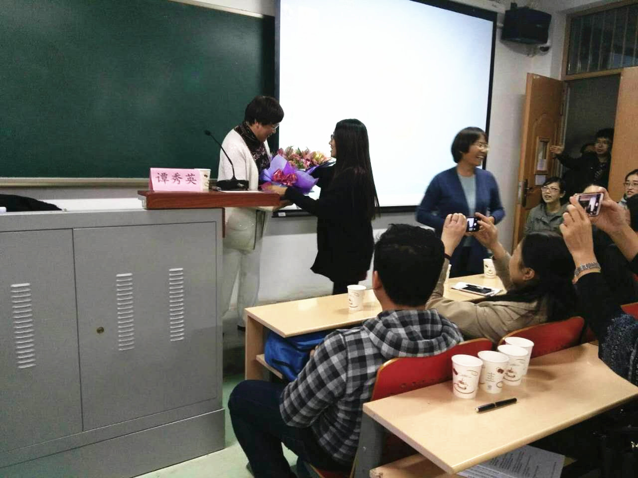 讲座结束后,董秀丽教授与卫灵教授再次上台表达对谭秀英教授此次精彩讲座的感谢,且代表中国国际关系女学人联谊会送予谭教授鲜花并拍照留影。