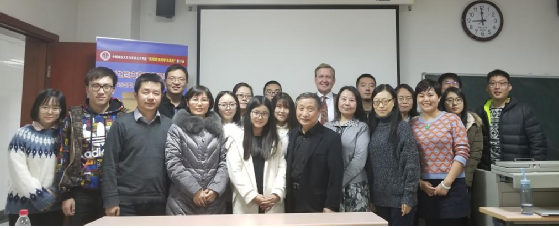参加本次活动的教师与报告人弗兰斯教授、翻译王琦博士合影