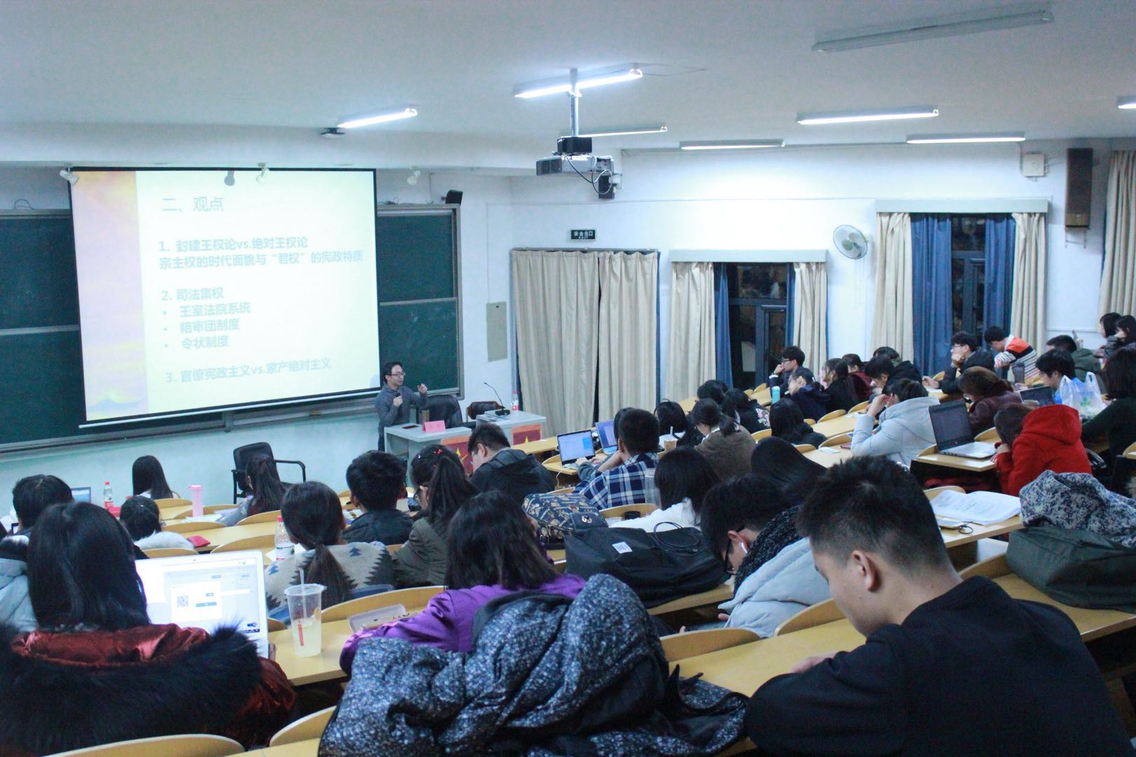 在此次讲座活动中,李筠老师以当今中国的发展为引,让同学们思考中国发展的现实原因,并以此引入当时的英国,类比英国发展的原因。李筠老师指出:一个国家崛起的原因自然是复杂多样的,有雄厚的经济或军事实力,但我们更要思考的是:英国崛起之时,中国才是当时经济实力最为强大的国家,为何崛起的不是中国?而放眼欧洲,当时的英国同样不如欧洲大陆上的西班牙帝国与法兰西帝国,为何是这个与欧洲大陆若即若离的岛国完成了最终的崛起?所以,最为重要的是英国先进制度的建立。在后续的过程中,李筠老师以生动的语言向大家详细介绍了英国先进制度的建立过程:从封建王权论到绝对王权论,英国率先将宗主权的制度转变为“君权”的宪政体制;从司法随意到司法集权,英国建立了王室法院系统、陪审团制度与令状制度;从官僚宪政主义与家产绝对主义的博弈中,英国逐步走近资本主义……正是这一系列制度的建立,为英国的崛起夯实了基础。李筠老师还向同学们介绍了纵向与横向国家结构,列举了同时期以英国、德国、波兰、法国为代表的四种国家结构。李筠老师在最后给同学们讲述了研究政治的正确方法:对历史提问才能解读历史,而对历史的借鉴并非纸上谈兵,研究同样也需要实践,日后的研究,必然是多学科的交叉。在同学提问环节中,李筠老师也耐心解答问题,并鼓励同学们在日后的学习与生活中关心现代中国的制度变化,留心转型期中国,如何更好得实现崛起。