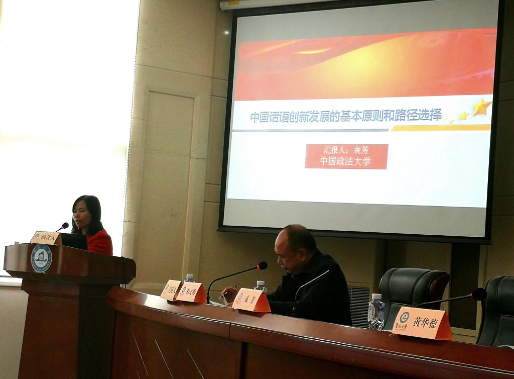 袁芳副教授参加了第一场的演讲,题目为《中国话语创新发展的基本原则和路径选择》。她提到,中国话语在创新发展过程中始终坚持三个基本原则——人民性、务实性和发展性;未来中国话语应遵循“四个相结合”的发展路径——中国立场与世界眼光相结合、继承传统与追求现代相结合、理论创新与实践探索相结合、保持稳定与适度弹性相结合。发言内容受到了与会人员的一致好评。