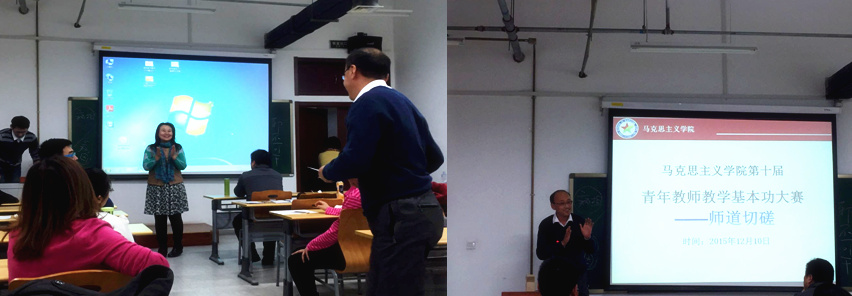 工会主席、博士生导师张秀华教授主持。她首先强调,每年一度的青年教师教学基本功大赛已成为马院一道亮丽的风景线、一个师生踊跃参与的盛会。与往届相比,今年又在“选手献艺”、“名师评点”、“全员评价”的基础上,增加了“观赏热身”和“师道切磋”的对话环节,从而体现共同提高教学艺术和教学境界的活动真意。