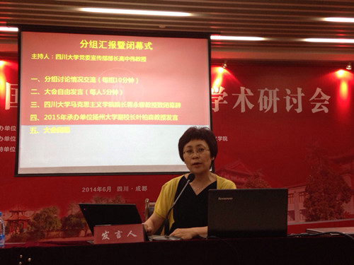 2014年6月6日—8日,全国思想政治教育学术研讨会在成都举行。来自全国多所高校和研究机构的专家学者170多人参加了研讨会。会议由中国社会科学院马克思主义研究院主办,四川大学禁漫 承办。邰丽华教授提交了《当前高校思想政治理论课教学的困境与出路》一文,并在大会闭幕式上针对分会场的讨论情况做了总结发言。