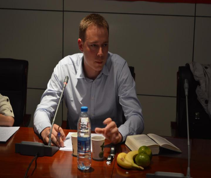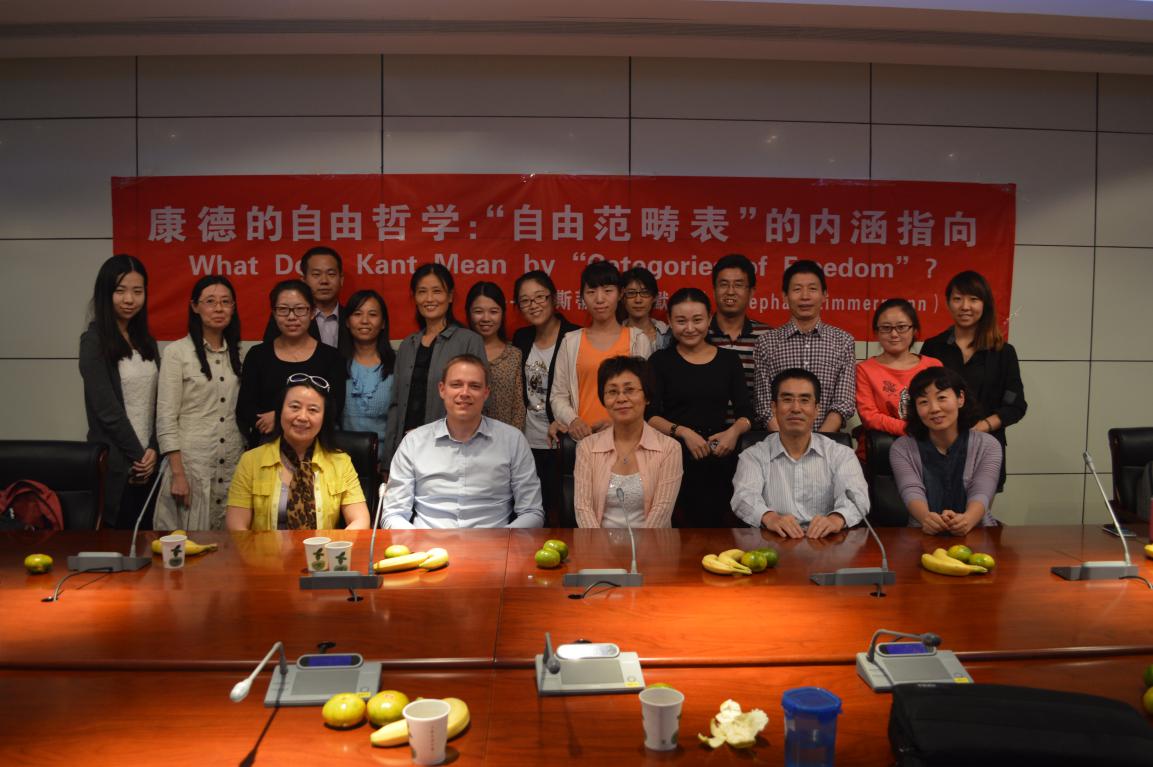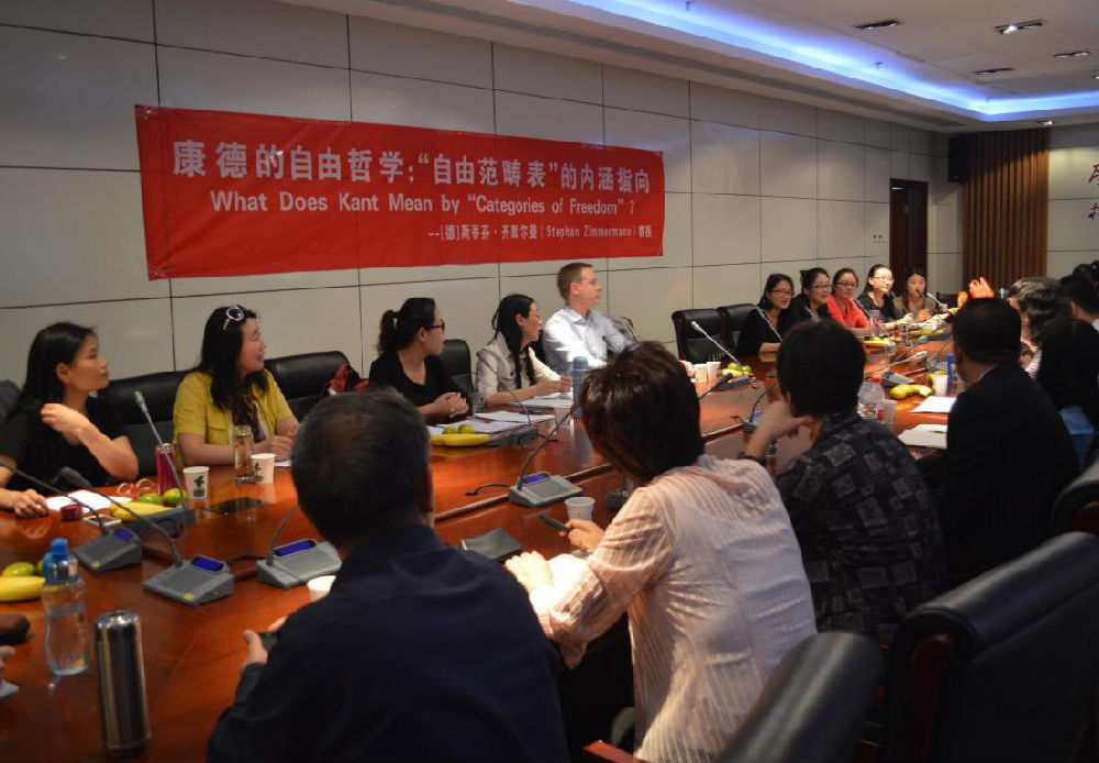 邰丽华教授代表学院对斯蒂芬·齐默尔曼教授的中国之行表示了热烈的欢迎,接着王今一老师对教授进行了简单的介绍。斯蒂芬·齐默尔曼(Stephan Zimmermann)是德国波恩大学哲学系教授,主要研究康德、黑格尔的政治哲学,曾获得DAAD学术奖,博士学位论文是《实践判断与范畴——康德批判哲学的自由范畴》,主要著作有《康德的自由范畴》、《什么是典型的纯粹实践理性》、《康德的道德论证》等。