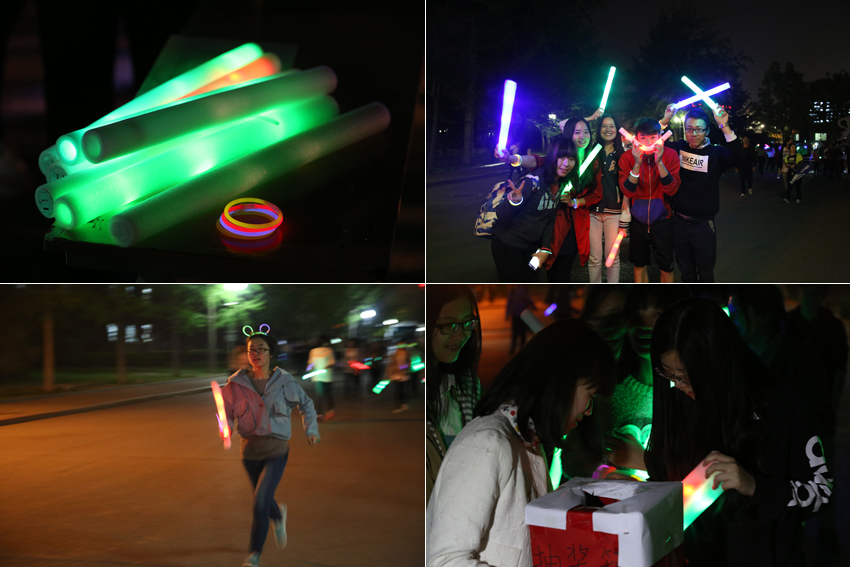 起跑的指令发出后,人群分不同的方向分散到校园各个地方,整个校园都被青春的活力点燃,人们奔跑的身影化成一个个跳跃的光点,大家不停的挥舞着荧光棒,为身边的同学加油打气,参与活动的人群,由最初出发的两人一组三人一对,变为了抽奖时每个人都能一起说说笑笑,场面无限温馨美好。