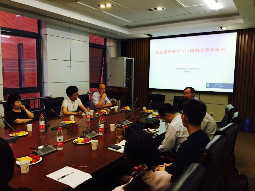 邱海平教授做了题为“马克思经济学与中国的改革和未来”的报告,他指出,当前国内经济学界重视西方经济学,弱化马克思主义政治经济学的趋势,阐明了马克思主义政治经济学的重要性,呼吁重新回到马克思经济学的正确轨道上来。邱海平教授结合时代主题和时代问题,对马克思的《资本论》进行了创造性的解读,认为马克思的经济学包含着丰富的关于经济发展和经济增长的理论,我们只要不抱着教条主义的态度,不带着意识形态的偏见,马克思经济思想的现实价值是重大的。马克思的经济学思想对西方经济学尤其是凯恩斯的经济思想发生了重大影响。邱海平教授还结合近期亚投行,一带一路的鲜明事例,深入的分析了在当前中国社会活跃的各种经济学思潮,认为坚持建设中国特色社会主义社会,进行深化经济体制改革的正确道路中,只有马克思主义经济学指导下的中国特色社会主义经济学才能真正保证中国经济稳定、持久发展。随后,老师们与邱海平教授进行了学术交流,同学们也认为受益匪浅。