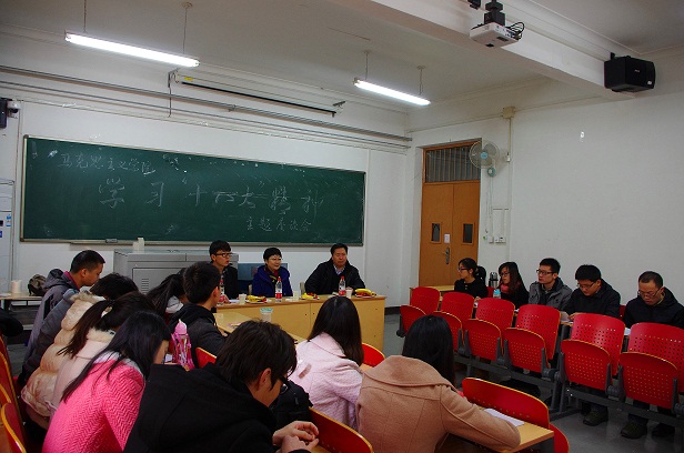 分党委书记卫灵教授、分党委副书记阮广宇老师出席座谈会,与马院研究生、博士生共话党的十八大。