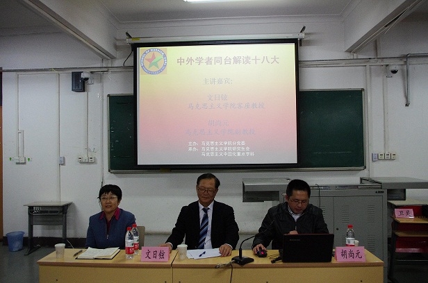 副教授、中共党史专业学科带头人胡尚元两位学者同台演讲,共同解读党的十八大。学院分党委书记卫灵教授主持会议,学院院长马抗美教授、学院分党委副书记兼副院长阮广宇副教授、副院长孙美堂教授、邰丽华教授以及孔祥宇教授、张秀华副教授、李良才老师等到场聆听了讲座。