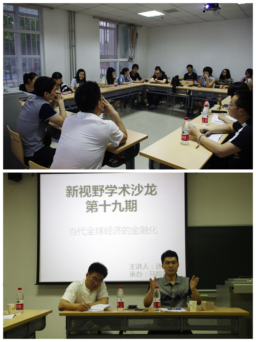 的硕士和博士生,整个座谈会在热烈的气氛中展开。座谈会由宋朝龙老师主持。许元荣老师从美国霸权入手,指出导致美国霸权衰弱的原因主要有两种:一种是美国的债务,另一种是其他国家的科技进步。并指出在当代社会中,金融已经成为主角,实体经济已经下降为配角的独特观点。又从六个方面详细精准的分析了金融决定经济的渠道:股市、债券、商品、外汇、信贷、经济预期。最后还说明了当代金融化的程度,指出要看懂经济必须懂得金融,从而说明了金融在当代全球经济中的重要性。许元荣老师还具体阐释了美国金融危机的发生机制以及美国金融危机通过货币霸权和国际资本市场的传导机制,分析了全球不同地区危机的不同表现以及经济危机向社会危机的转移机制.