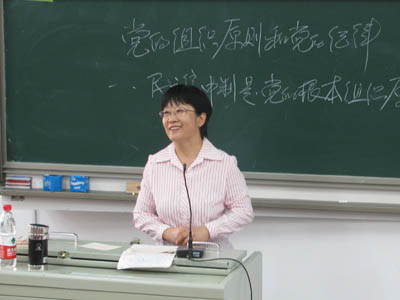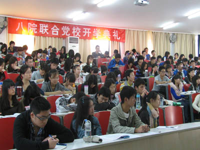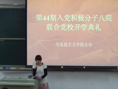 8点半,伴随着庄严地国歌声响起,开学典礼正式拉开了序幕。紧接着,由入党积极分子代表——马院10级的孙雯发言,她表达了自己对党事业的无限热情,并作出庄严保证,努力学习,争做一名优秀党员。典礼的第四项议程是由卫灵教授发言并教授第一课。讲话中,卫灵教授着重强调了党的原则和纪律,告诫大家要有正确的入党动机,树立高度的责任感,做一个优秀的共产党员,自觉履行党员应有的义务和责任,卫灵教授的讲话对在座所有的入党积极分子意义深重,她的第一课同样给予大家以启示,她用各国各地的实例为大家讲述了党的组织原则和党的纪律,深入浅出,在大家的脑海里烙下了深刻的印记。她向大家讲述了有关党的知识和入党原则,这让同学们对党有了更深的了解,也让同学们更加坚定了入党的决心。