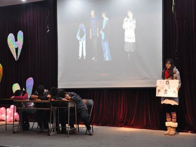 表演了以“大梦”为主题的短剧。该短剧围绕着四个对未来充满了期盼但自己的现实又距理想遥远的青年展开,这四个青年分别由刘张玉洁、陈亮、冯金宇和薛雨豪扮演。全剧共分为四幕,首先是对四个主人公的现状进行简单介绍的引子,在引子中他们拖着劳累了一天的身体及疲惫的心分别陈述了自己对现实的无奈以及对未来的不确定,然后他们在劳累中沉睡过去。之后以冯金宇的足球之梦主题的第一幕开演,配合着解说员的解说词以及台上演员们的精彩表演,台下观众掌声连连,在本幕的结尾冯金宇带领马院赢得了足球冠军。接着上演了第二幕陈亮的巨星之梦,在梦中已为巨星的陈亮受到歌迷的热烈欢迎并向歌迷们表达了自己的感激之情,最后,在歌迷们的拥护中,陈亮退下场。在乡亲们的热烈欢迎中,第三幕——薛雨豪的大官之梦开启,身为官员的他到基层视察丰收情况并受到了乡亲们歌舞欢迎,他还对乡亲们进行了亲切的问候。最后,第四幕刘张玉洁的女强人之梦上演,在梦中化身为女强人的刘张玉洁带着秘书与一个庸俗的女老板谈判,最终她成功地签订了合同。四幕结束后,由麻静洁扮演的天使讲述了有关梦想的话后,四人渐渐从梦中苏醒,最后,伴随着组合“老男孩”的歌声,该剧结束。
