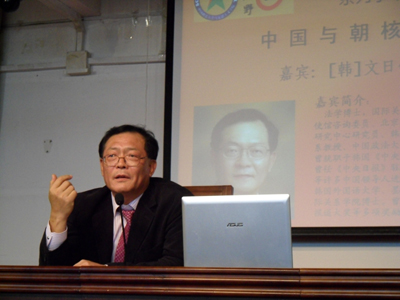 文教授讲座的题目是《中国与朝核危机》。首先,文教授介绍了朝核危机爆发的历史背景和主要历程。随着90年代冷战体系的结束,中俄两国对朝援助的减少、中断,朝鲜经济发展陷入困境,同时美韩、美日关系得到加强,俄韩、中韩关系也得到改善。这些历史性的变化让朝鲜深感国际孤立和安全威胁。所以,朝鲜迫于生存的压力急切发展核武,以获得军备战略优势、摆脱不利国际环境。文教授认为朝鲜的选择主要基于以下三个方面的考虑:安全考虑——期待核武提供安全保证;生存考虑——此关系到政权的生存问题;经济考虑——获得国际经济补偿的筹码。当然,朝鲜的选择与长期以来美对朝的敌对政策有很大的关联性。第二,文教授以国际关系的宏观视角分析了相关国家应对朝核危机的立场。韩国:作为直接受威胁者,其坚决不能容忍朝鲜发展核武,因为这不仅危及韩国经济发展所需的和平周边环境,而且有害于朝鲜民族统一进程的前景。日本:坚持朝鲜必须拆除核设施、停止核武研制活动,这是日朝建立正常外交关系的前提,否则对日本安全是一大威胁。俄罗斯:反对朝鲜拥有核武,不承认其核地位,既忧心核武落入本国分裂势力手中,也在地域上对俄构成安全威胁。美国:反对朝鲜发展核武,担心既有核武国际秩序被破坏,以及核武同恐怖势力的结合,同时朝鲜发展核武也会破坏东北亚战略平衡。中国:坚持朝鲜半岛无核化,否则危及东北亚地区的和平稳定,以及可能引起韩、日、台等发展核武的诉求。第三,文教授着重分析朝核危机应对的中美共识与分歧。坚持朝鲜半岛的无核化、维护东北亚地区的稳定、主张通过对话和平解决危机、认可六方会谈是解决之途和加强中美合作等是中美的主要共识。但是,两者在制裁措施和力度上存在分歧。最后,文教授认为恢复六方会谈是朝鲜的必然选择,也是各国期待的现实途径。但是,谈判之路是漫长的,这是各方利益协调艰巨的必然结果。