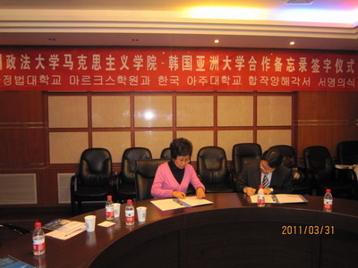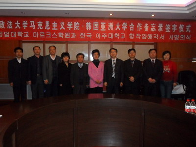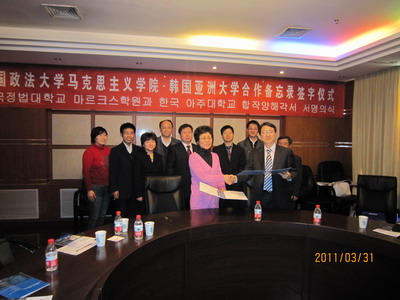 与韩国亚洲大学在昌平校区签订双方合作备忘录。仪式由孙美堂副院长主持,出席此次仪式的有分党委副书记、副院长阮广宇、副院长邰丽华、马克思主义与中国国情研究所副所长刘媛媛、马克思主义基本原理研究所副所长赵卯生、伦理学研究所赵庆杰以及办公室李良才和于丽老师,亚洲大学方面由亚洲大学国际协力部部长李东烈、亚洲大学北京办事处主任韩康一作为代表出席仪式。