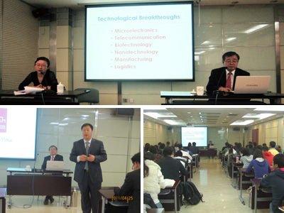 接着,白圣基校长为同学们做了题为《英才、创造力和大学的功能》的演讲。他说,韩国与中国类似,我们现在不缺少世界顶尖级的演员、体育明星;但是,我们缺少真正有创造力的人才,如微软总裁比尔·盖茨,苹果公司创始人沃兹尼克和乔布斯,以及诺贝尔物理学奖、化学奖获得者那样的人才。除日本外,东亚国家要培养出这样的人才,路还很长。接着,白校长以对“创造力”进行深刻而新颖的诠释,并介绍了浦项科技大学培养创造性人才的大学理念。