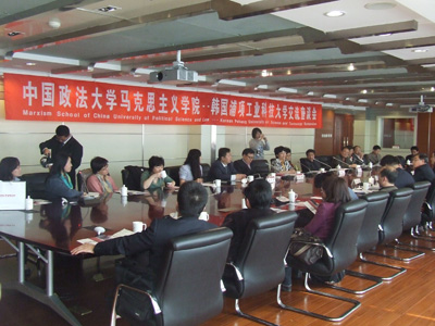 黄进首先代表学校向白圣基校长一行来访表示热烈欢迎,随后双方互相介绍了学校的概况和发展历史,并就合作事项进行了深入探讨。黄进提出双方可以通过学生互换交流、教师互访等形式达成长期合作,并欢迎对方选派学生到我校学习。白圣基校长也表示浦项工科大学的学生有理科优势,希望借助法大的文科优势增强实力,希望两校能实现教育互补。最后,双方达成合作共识,以组织两校学生夏令营为起点,逐步拓展双方合作渠道,共同推进两校发展。