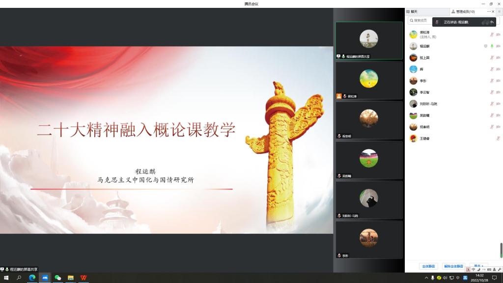 中国共产党第二十次全国代表大会,是在全党全国各族人民迈上全面建设社会主义现代化国家新征程、向第二个百年奋斗目标进军的关键时刻召开的一次十分重要的大会。为了深入学习贯彻党的二十大精神,推动二十大精神进基层、进校园、进课堂,马克思主义中国化与国情研究所开展了集体学习备课活动。