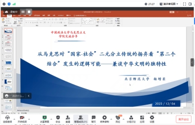 杨增岽教授从马克思以“国家—社会”二元分立传统的扬弃看“第二个结合”发生的逻辑可能——兼谈中华文明的独特性为题,从马克思主义基本原理同中华优秀传统文化之间的关系进行探究剖析,阐述马克思主义以其科学性、革命性、实践性、人民性和发展开放性激活中华文明的基因,在中华优秀传统文化中寻找中国式现代化进程的灵感。杨增岽教授鼓励研究生导师提升对历史和中华优秀传统文化的认识,在社会科学的整体知识体系中掌握科学有效的研究和培养方法,从更广阔的研究视野看待马克思主义研究,从而在指导学生工作中增强学生对世界历史、中国历史的关注,提高学生的学习和研究能力。