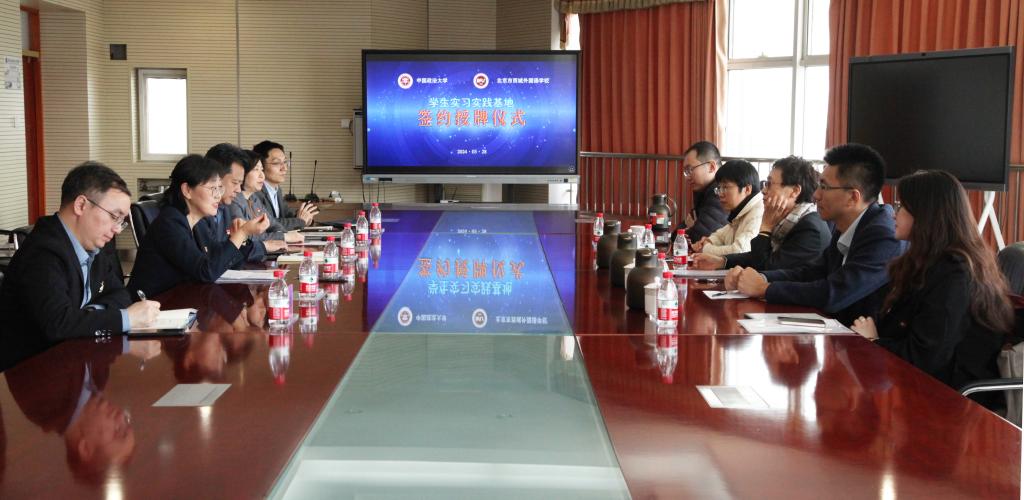 与北京市西城外国语学校共建学生实习实践基地签约授牌仪式在西城外国语学校百万庄校区会议室举行。学院执行院长邰丽华、党委副书记王丽娜、院长助理张杨、研究生工作办公室主任韩文杰、本科生辅导员马啸参加签约仪式。仪式由西城外国语学校副校长殷洪涛主持。