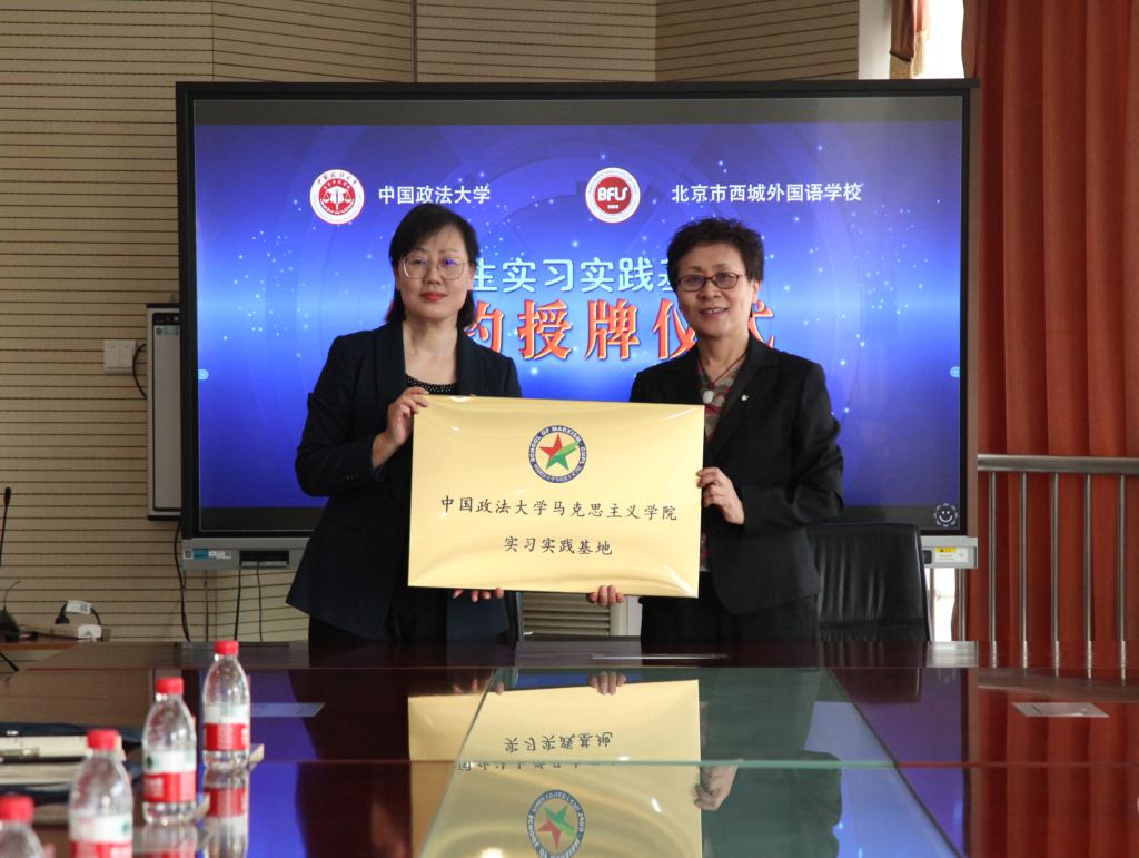 随后,执行院长邰丽华与西城外国语学校校长范雪梅共同签署共建学生实习实践基地协议书并进行了授牌仪式。