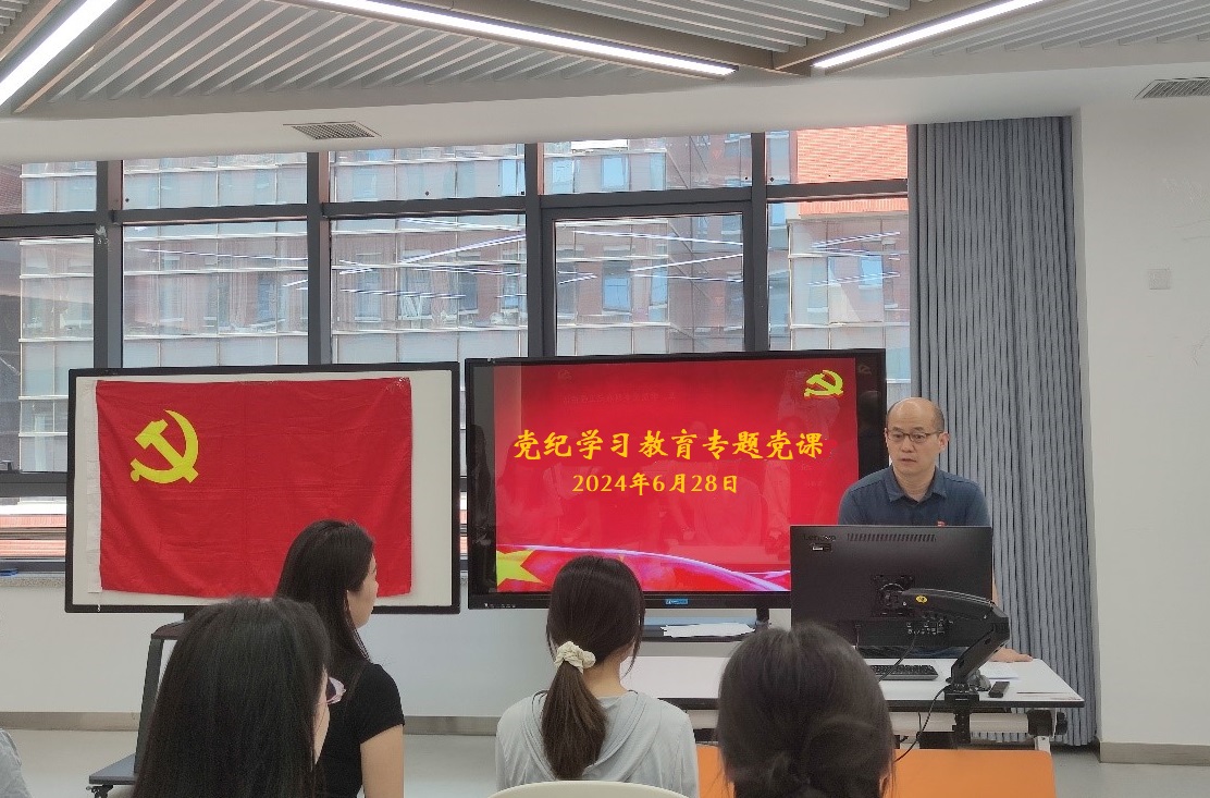 为深入学习贯彻习近平总书记关于全面加强党的纪律建设的重要论述,推动党纪学习教育走深走实,6月28日下午,学院党委副书记王强以“学纪知纪守底线,明纪守纪作表率”为题讲授专题党课。2023级博士研究生党支部全体党员和2024上半年学院党委新接收的全体预备党员参加,活动由学院党务秘书金璐主持。