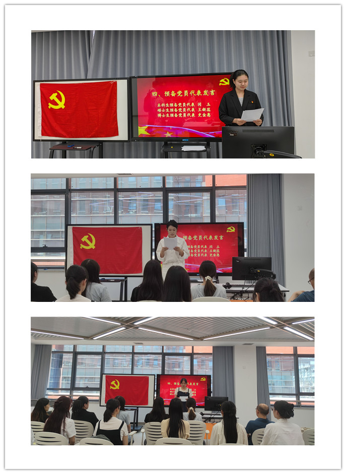 闫玉、王新蕊和史金惠分别代表本科生、硕士研究生、博士研究生预备党员发言。闫玉回顾了从递交入党申请书到加入党组织以来的心路历程,表示一定要积极响应党中央号召,坚守政治信仰,加强党性修养,以更加昂扬的斗志和更加坚定的信念投入到党的事业中去。王新蕊向党组织表达了要提高政治理论素养、严守党的纪律和坚决服从党的领导的三个决心,要为实现中华民族伟大复兴的中国梦而努力拼搏,为党的事业贡献青春智慧和力量。史金惠做出了作为青年党员要坚定信仰、践行党的宗旨、恪守党的纪律和积极投身党的事业,以实际行动为国家富强而奋斗的庄严承诺。