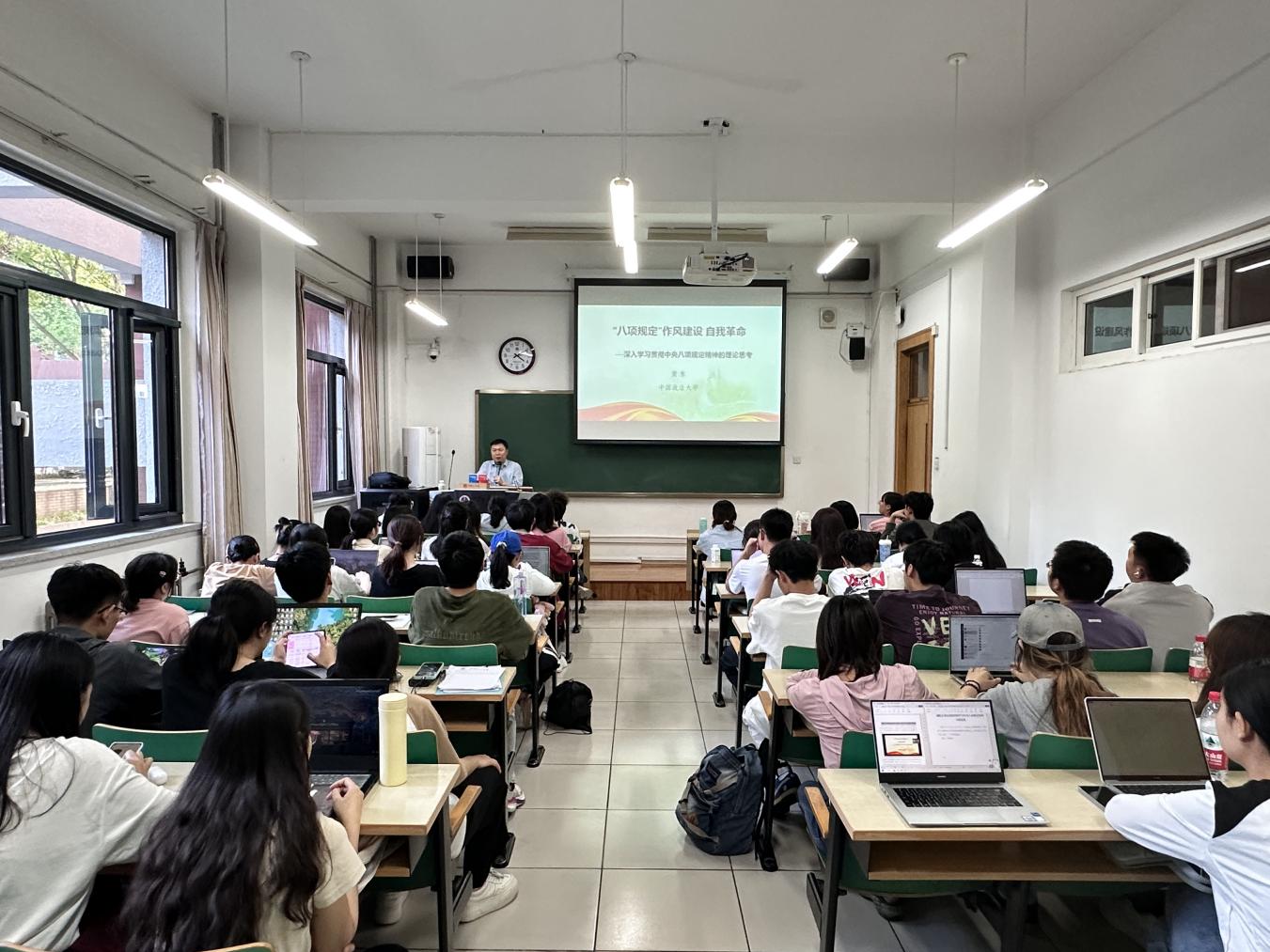副院长、本科生党支部理论学习导师黄东教授为全体支部党员和入党积极分子同学讲授了题为“‘八项规定’作风建设 自我革命——深入学习贯彻中央八项规定精神的理论思考”的专题党课。