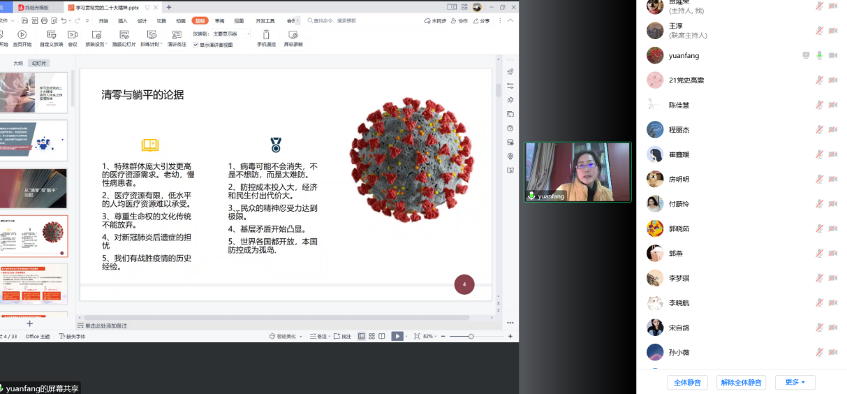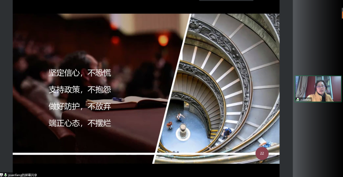 袁方从关于疫情防控的“清零与躺平”争论谈起,批评了极端清零和彻底躺平两种对立思维。她强调,要坚持科学理性防控,及时准确把握疫情发展规律;要坚持人民至上的精准防控,走群众路线;这是防疫措施必须坚持的两条原则。她分析了高校防疫的特殊性及防疫措施已取得的成果,并对同学们要在疫情期间采取好防疫措施提出基本要求。带领大家廓清思想迷雾,坚持党的领导、坚持精准防控不动摇。