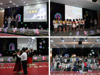 晚会在四位主持人的追忆与祝福中开始。一段精彩的开场视频收录了2010届毕业生四年中在学校的点点滴滴,将06级同学们的思绪拉回到四年中一起生活、一起奋斗的那些与青春有关的日子,现场的气氛立即被调动了起来。随后,阮广宇老师上台表达了他对于马院2010届毕业生的祝福,祝贺他们顺利毕业,祝愿他们前程似锦。之后,本次晚会文艺表演正式开始。