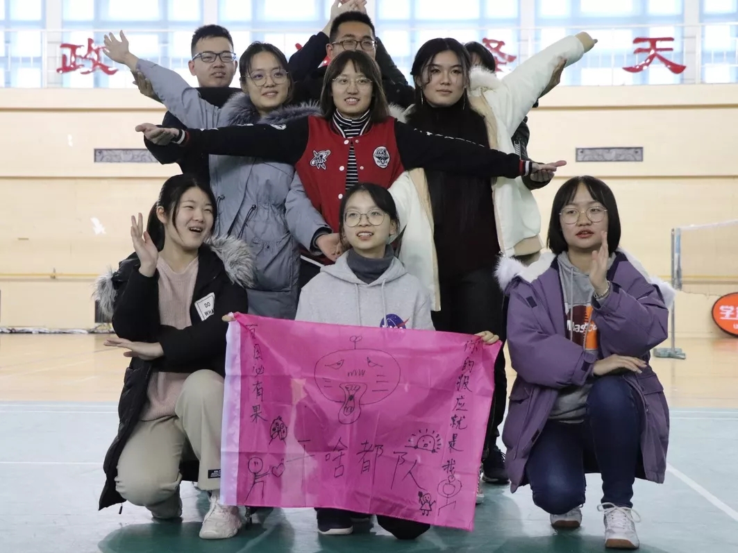 所有同学被随机分为四个队伍,首先进行的是每个团队的破冰活动。同学们脑洞大开各显神通,设计自己的队旗,并为自己的队伍设计队名、口号和队形。在大家积极的配合下,短短十五分钟的时间内每个队伍就都完成了这项内容,激动地展示自己队伍独特的旗帜并一起合影留念。在上面的热身小运动结束后,游戏环节正式开始了。本次活动共有五大游戏项目,分别为:并足前进、爱的魔力转圈圈、极速60秒、“咱们团结有力量”以及最后的终极活动—翻纸牌!