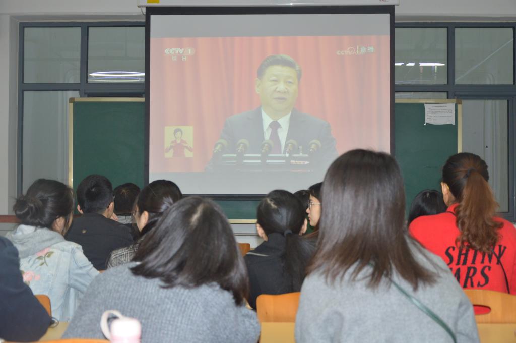 九点,大会开始。国歌的声音奏响,振奋人心。大会第一项全体为毛泽东、周恩来、朱德、邓小平、陈云等已故老一辈无产阶级革命家默哀。而后,中国共产党代表人习近平进行报告,同学们都不约而同地拿出了笔记本,记录着19大报告的重要内容。听完报告后,所有同学都撰写了观后感,并提交到了学校,其中部分同学的感想刊发在学校的微信平台上。