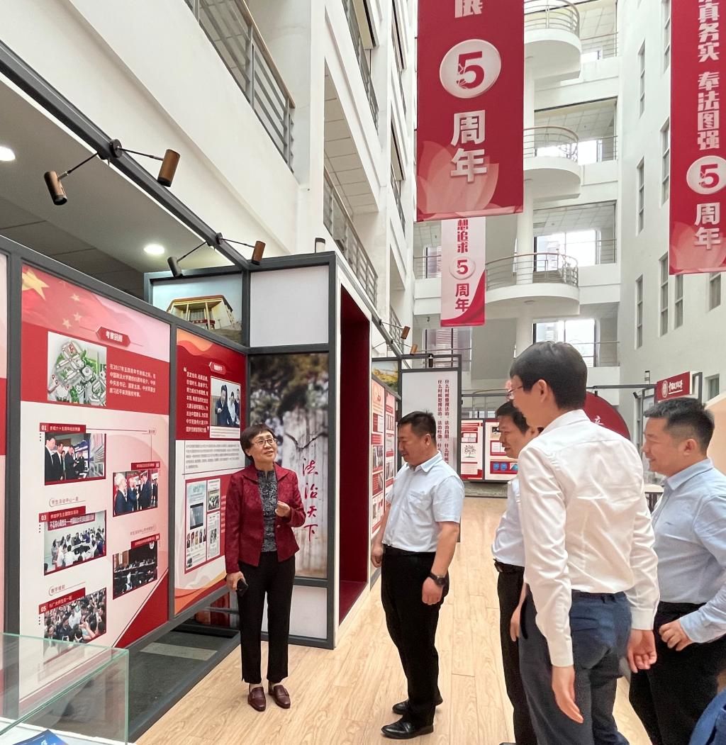 学习贯彻习近平新时代中国特色社会主义思想主题教育读书班来到昌平校区逸夫楼一层大厅,参观学习《习近平总书记考察法大五周年工作成果展》。