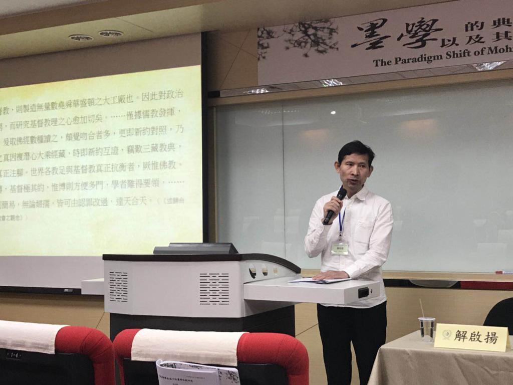 应台湾辅仁大学邀请,禁漫 解启扬教授于2019年5月2日出席了辅仁大学华裔学志汉学研究中心主办的“墨学的典范转移以及其与基督宗教之相遇”的国际学术研讨会,并在大会上作了《大乘佛学视域下的墨耶比较研究》的学术演讲,与参会专家进行了深入的学术探讨。