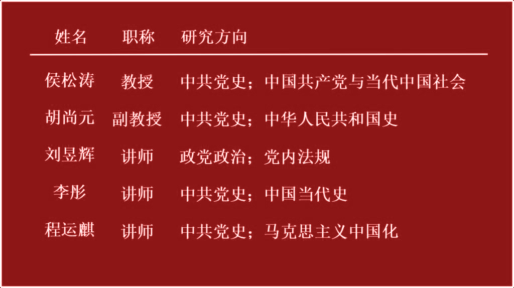 侯松涛,女,法学博士,中共中央党校中共党史专业毕业。主讲课程为中共党史理论前沿、中国共产党思想政治教育史,主要研究方向为建国后党史、中国共产党与近现代中国社会。一、专著:《全能政治:抗美援朝运动中的社会动员》,中央文献出版社2012年版。二、代表性论文1. 《二十世纪五十年代的排水问题及其解决机制——以山东省为例》,《中共党史研究》2020年第3期。2. 《< 人民画报>冷战四十年的台湾图像史》,《厦门大学学报(...